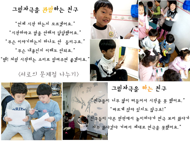 나름대로의 그림자극을 시도하는 새싹반 어린이들은 계획되지 않은 극놀이에 서로의 불편한 점에 대해 이야기 나누어보는 시간을 가져보았습니다.