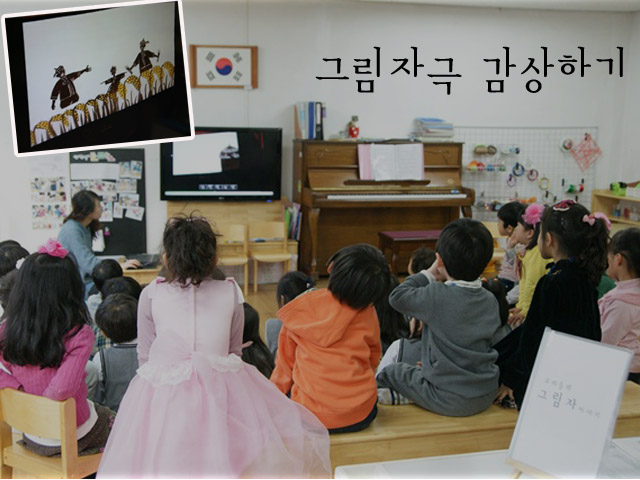 “친구들이 너무 많이 떠들어서 시작을 못 했어요.”, “바르게 앉아 있지도 않구요!”, “친구들이 다른 영역에서 놀이하다가 연극 보러 왔다가 자꾸 왔다갔다 거려서 제대로 연극을 못했어요.”우리는 좀 더 그림자극다운 극을 위해 다른 사람들이 한 그림자극을 감상해 보는 시간을 가져보았습니다.