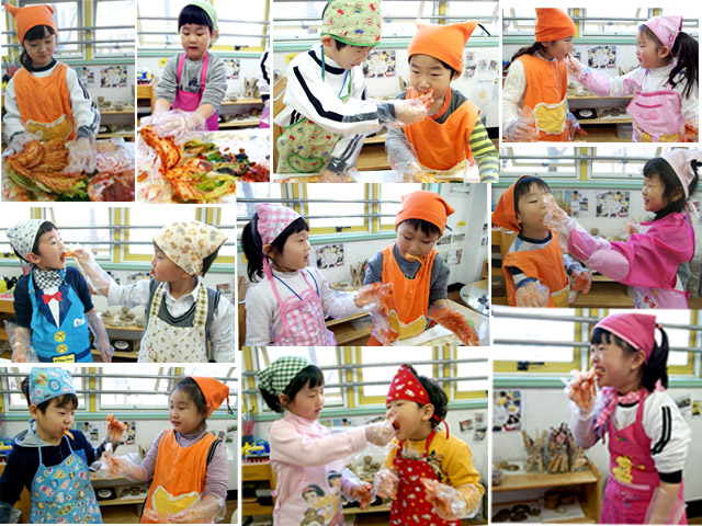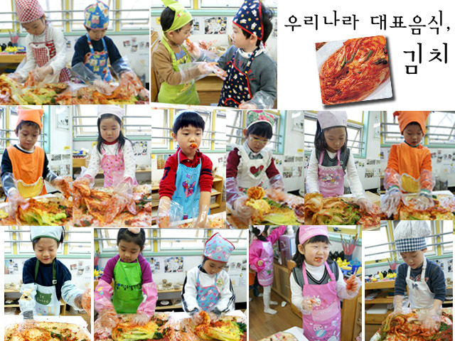 우리나라 대표 음식인 김치! 찬바람이 쌩쌩 부는 겨울을 맞이하여 김장을 해봅니다. 먼저 김치의 유래, 다양한 종류, 그리고 비타민 A, B, C 모두 포함된 음식으로 대표적인 건강식품이라는 것 등 김치에 대한 여러 가지 이야기를 나누어 본 후 어린이들의 김장 담그기에 관한 경험을 들어보았습니다.