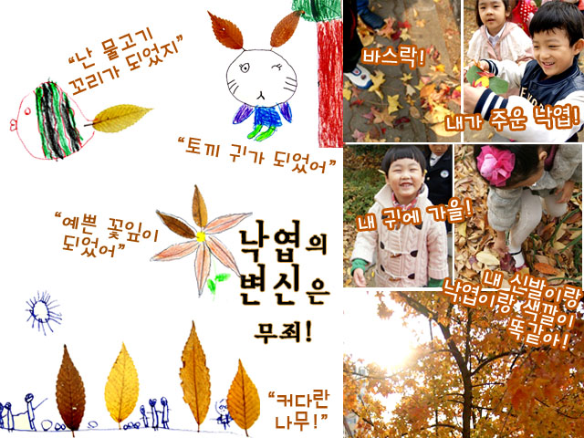 “얘들아~ 이 낙엽에 빨간색도 있고 노란색도 있다!”