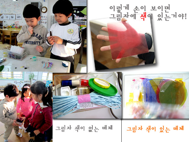 색이 있는 그림자를 가진 매체는 어떤 것인지 정확하게 정의를 내리지 못한 새싹반 어린이들은 여전히 색이 있는 그림자를 찾기 위한 연구를 하고 있습니다.
