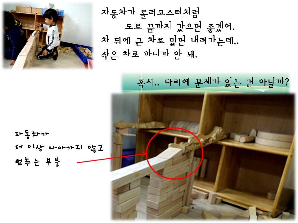 튼튼한 다리를 완성한 아이들은 다리 위에서 자동차를 굴려봅니다. 다리의 기울기에 따라 위치에너지가 운동에너지로 변하면서 자동차는 아이들이 손을 대지 않아도 저절로 아래로 움직입니다. 하지만 가운데의 연결 부분에서 자동차는 더 이상 움직이지 않고 멈추어 버립니다.멈추어버린 자동차가 움직이게 하기 위한 아이들의 전략이 다양한 방법으로 변화됩니다.