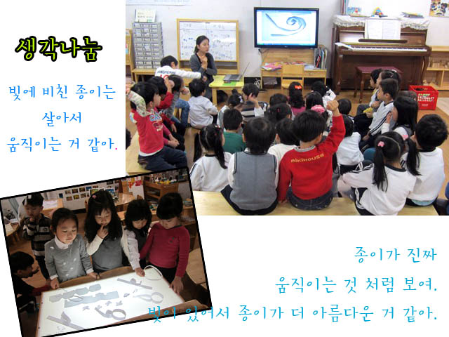 어린이들은 종이를 다양하게 변형시키며 놀이를 이어가면서 빛과 만난 종이의 모습에 대한 이야기를 펼쳐냅니다.