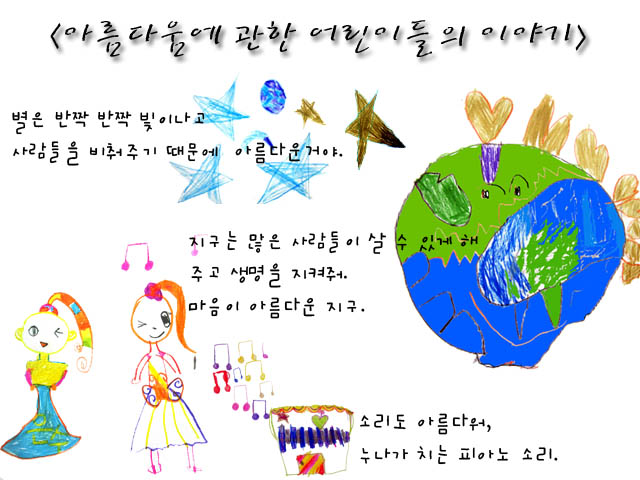종이작품 감상에서 이어지는 아름다운에 관한 어린이들의 이야기 속에는 눈에 드러나는 시각적인 장면에 대한 감상을 넘어서 내면의 아름다움, 가치로운 것에 대한 아름다움까지 생각하는 것을 볼 수 있습니다.