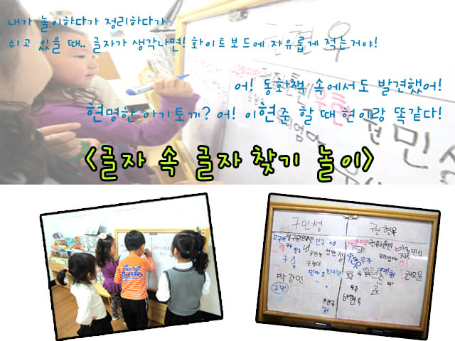 글자에 차츰 많은 관심을 보이는 어린이들이 내가 가장 많이 접하고 쓰는 글자인 친구 이름에서 비슷한 글자를 찾아냅니다. “구민성? 민경린? 똑같다.” “나도 ‘민’ 있는데! 박민규” 하나, 둘 알고 있는 글자를 생각 해 내고 써보면서 아이들은 자연스럽게 <글자 익히기>를 해 나갑니다. “김선환? 환경!” “김의진 선생님 할 때도 똑같이 들어간다.” “김은수? 우리 엄마이름 은정 할 때 똑같아.” “우리 책에서도 똑같은 글자 찾아볼까?” 매일 2명의 친구 이름이 화이트 보드에 적히고 친구 이름과 같은 글자를 찾아 적어봅니다. 내가 생각한 글자를 기록하고 친구들과 함께 공유할 수 있다는 것이 자극이 되어 어린이들의 쓰기 활동은 활발히 진행되고 있지요. 어린이들이 글자쓰는 즐거움을 알아갈 수 있도록 가정에서도 격려 해주세요!<가을열매>