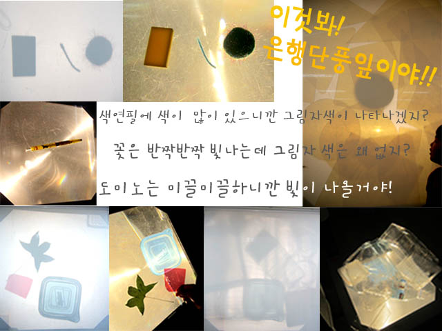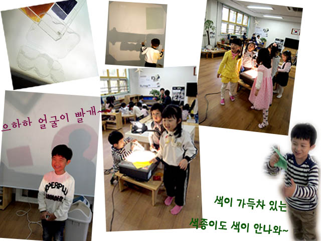 새싹반 어린이들은 ‘종이에 파란색연필로 색칠하면 파란색이 나타 날거야.’라는 가설을 세우고 실험을 해보았습니다. 실험결과, 종이에 아무리 색을 칠해도 그림자에 색이 있는 것은 아무런 상관이 없음을 알게 되었습니다. 그래서 어린이들은 교실에 있는 여러 가지 매체를 놓아보며 어떤 매체의 그림자가 색이 있는지 알아봅니다.
