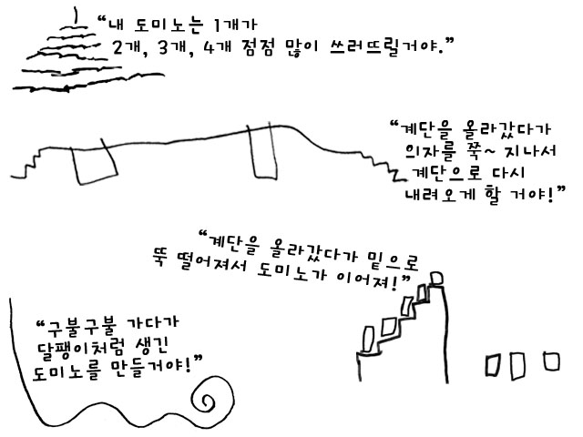 “난 형님들처럼 계단을 올라가는 도미노를 해볼 거야.” “난 구불구불하게 할 건데.” “난 계단으로 올라가서 의자로 쭉~ 가는 도미노!” “터널을 지나가는 도미노도 재미있겠지?”