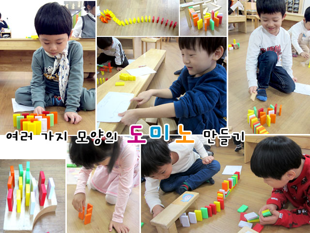 도미노의 형태가 다양해진 만큼 더 어렵고 실패하는 일도 많아집니다. “왜 안 되지?” “아~실패다 실패.” 거듭된 실패의 경험에 “난 도미노 안할래!”하던 친구도 포기하지 않고 끝까지 해내자 도미노를 세우고 뿌듯함을 감추지 못합니다. 포기를 모르는 어린이들의 도미노가 자랑스럽습니다.