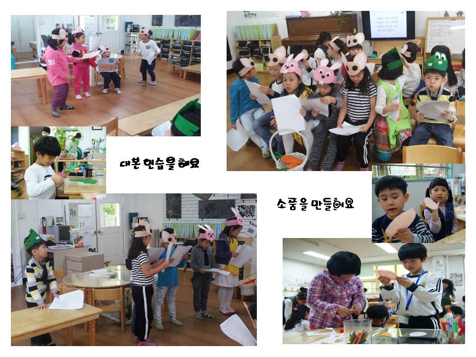 선생님들의 동극을 본 뒤 동극의 내용에 이해를 더하기 위해서 동화책을 들려주었습니다. 그런 뒤 동극에 나오는 등장인물에 대해서 알아보았답니다. 등장인물에 머리띠도 만들고 동극에 필요한 소품들에 대해서도 생각하며 같이 만드는 시간을 가졌지요. 제비뽑기로 배역도 정하였답니다.