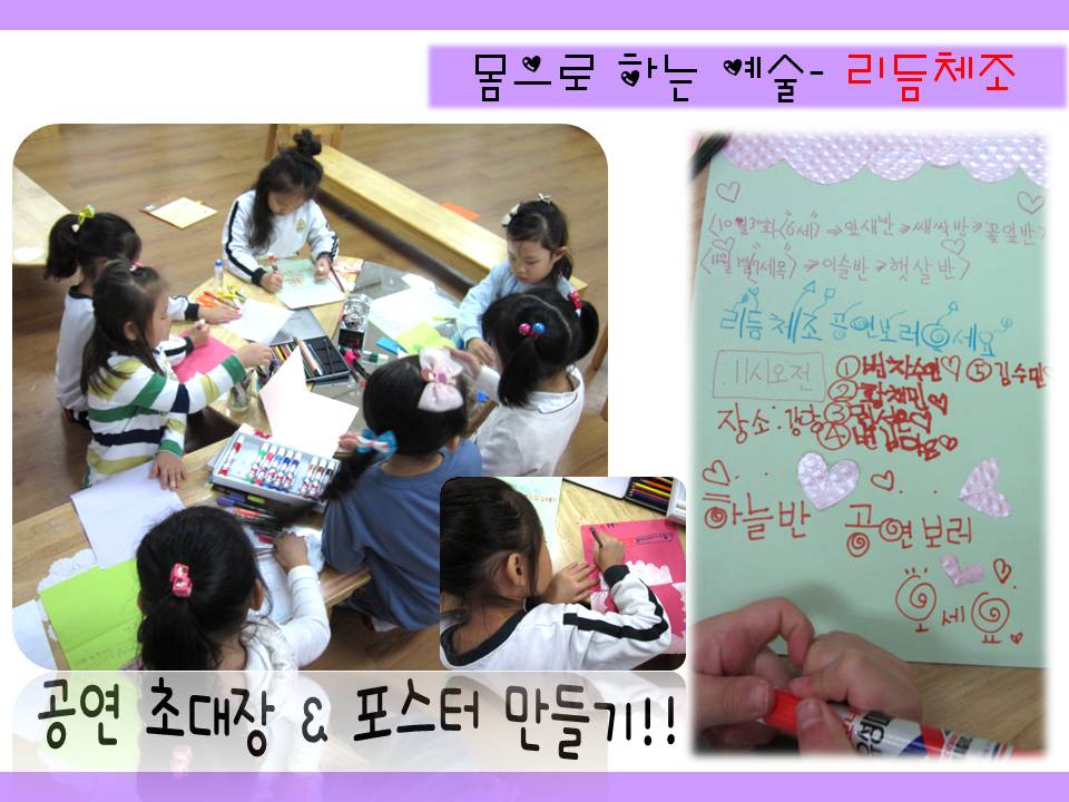 공연을 알리기 위한 초대장과 포스터 디자인을 위해 모인 유아들... 달력을 보면서 공연 날짜를 의논해 봅니다. “공연은 두 번으로 나누어 하면 좋을 것 같아~” “한꺼번에 다 초대할 수 없으니깐 동생반과 7살반을 나누어서 초대하자~” “그럼 날짜와 요일은 좋을까?” “월요일에 공연 준비하고 연습할 시간이 필요하니깐 화요일이 좋을 것 같아요~” “그리고 또 하루 연습하고 목요일!” “그러면 10월 30일과 11월 1일에 하면 되겠어요~” “시간은 11시로 하자~” “자~ 그러면 초대장을 만들어 볼까?” “난 공연을 알리는 그림을 넣어서 꾸며 볼거야~” “종이를 예쁜 무늬로 자르고 붙여서 초대장을 만들거야~”“초대장에 규칙을 적어서 알려주면 좋겠어~”