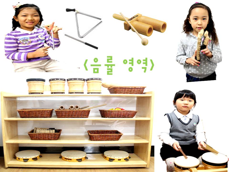 하늘반에 새로 생긴 음률 영역! 음률 영역에는 리듬막대, 우드 블록, 탬버린, 귀로, 피아노, 탬버린, 트라이앵글 등 다양한 리듬악기가 가득하답니다.