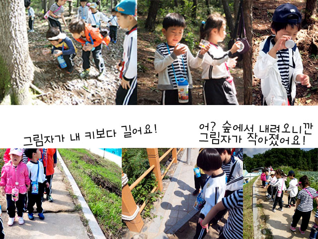 “와! 그림자다!” “우리랑 같이 갈려고 숲까지 따라 오네~.” “그런데 내 키보다 더 길다!” “어~! 진짜네~”