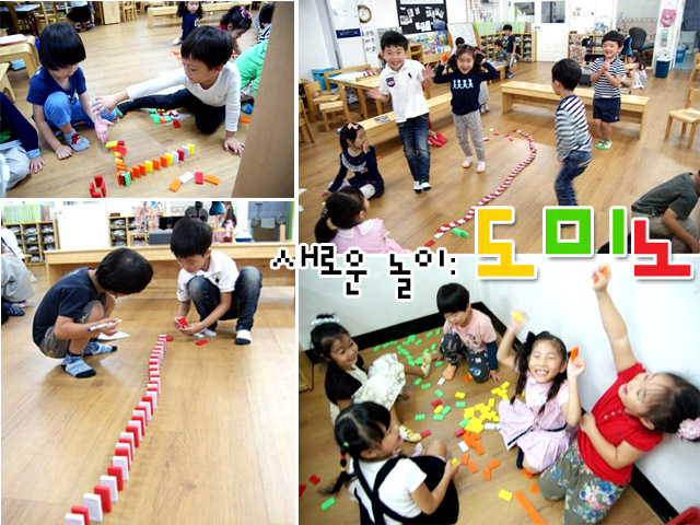 새싹반에 새로운 놀이감이 제공되었습니다. 그것은 바로 도미노입니다. 도미노는 누구나 관심과 흥미를 가지는 놀이감으로 어린이들의 적극적인 참여를 유도할 수 있는 즐거운 놀이입니다. 교사는 이러한 도미노가 어린이들을 집중할 수 있도록 하고 도미노를 쌓는 동안 인내력을 기를 수 있으며, 그 속에서 성취감을 얻을 수 있을 것이라 기대하고 지원하였습니다.
