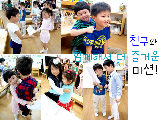 유아기에 어린이들이 익혀 나가야 할 가장 중요한 덕목 중 하나는 바로 <사회성>입니다. 요즘 새싹반 어린이들은 혼자 하고 싶은 활동을 하는 것에서 더 나아가 새로운 것을 발견하거나 알게 되면 <친구>에게 먼저 알려주며 함께 합니다. 이러한 새싹반 어린이들에게 친구를 좀 더 알아가고 친해지기 위한 방법으로 친구와 함께하는 미션 활동을 해 보았답니다. 친구를 꼭 안아주고 열(10)세기, 친구와 악수하기, 눈 마주치고 다섯(5)세기, 마주보고 손뼉 열 번 치기, 엉덩이 뽀뽀 다섯번하기, 친구 안마 해 주기, 친구와 가위 바위 보하기 이렇게 7가지의 미션을 수행하며 친구의 사인을 받는 활동이었습니다. 친구에게 먼저 다가가기 힘들었던 어린이들도 이제는 먼저 다가가기도 하며 어린이들 모두 친구와 함께 하는 즐거움을 느껴 보았습니다.