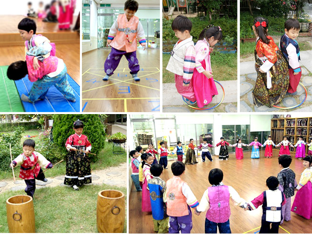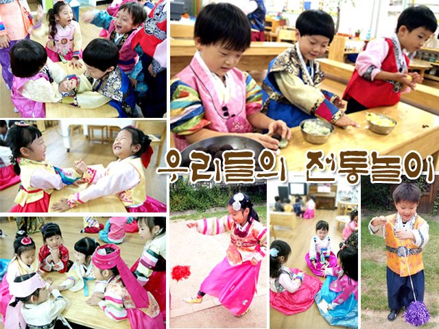 그 밖에도 교실과 강당, 그리고 제법 선선한 바람이 부는 유치원 밖에서는 공기놀이, 딱지치기, 팔씨름, 씨름, 투호 던지기, 제기차기, 왕대포 놀이 등을 경험하였습니다. TV, 컴퓨터 등 혼자 하는 놀이에 익숙한 어린이들은 “전통의 날”을 통해서 그 옛날 우리 선조들이 그러했듯이, 친구들과 주고받으며 딱지를 치고 새싹반 친구들, 선생님과 함께 손잡고 강강술래를 하는 경험에서 공동체 의식과 더불어 사람과 사람의 어울림을 느꼈을 것이라 생각되어 집니다. 풍성하고 따뜻한 명절 추석. 온 가족이 모여 송편을 빚고 전통놀이를 하고 달을 보며 가족의 건강을 기원하면서 우리가 자랄 적 그랬던 것처럼 어린이들에게 우리나라 고유의 전통성과 역사성을 경험하게 해 주세요^^