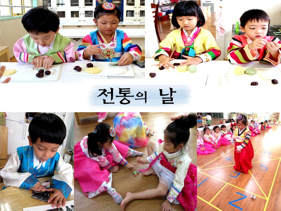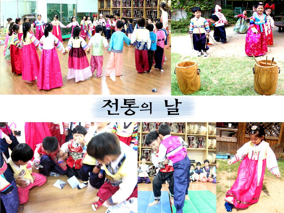 <야외>에서 흥겨운 전래동요를 들으며 투호놀이, 제기차기, 왕대포 놀이도 하고 <강당>에서는 강강술래, 땅따먹기 게임도 해보았답니다. 친구의 손과 손을 맞잡고 둥근 원을 만들어 강강수월래를 해보며 우리나라 전통문화를 한마음으로 즐기는 시간이 된 것 같습니다.