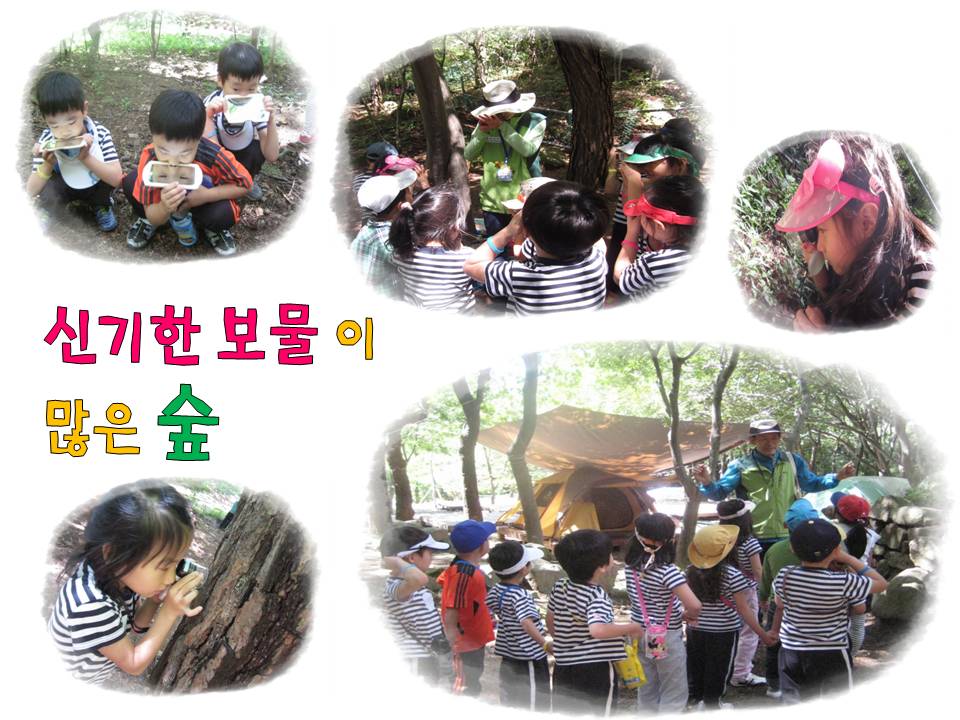 이번에는 숲의 모습을 거울로 탐색해봅니다. “거울로 관찰하니까 숲에 지진이 일어난 것 같아요” "아~ 어지러워~ 내가 하늘 위로 걸어가는 기분이야." 또 루페를 통해 다양한 자연물들을 자세하게 관찰해봅니다. “애들아~나뭇잎 좀 봐~ 눈으로 나뭇잎 잎맥을 볼 때에는 희미해서 잘 안 보았는데 루페로 보니까 더 선명하게 볼 수 있어!” “루페로 꽃을 보니까 꽃이 거인처럼 크게 보여~너무 신기하다!” 짧은 시간이었지만 숲을 몸으로 느끼며 자연과 더욱 가까워지는 소중한 경험을 할 수 있었답니다. 또,숲에서 만난 신기한 보물들에 대해 친구와 이야기를 나누며 숲을 더욱 깊이 알아갈 수 있었답니다. 숲체험이 어린이들에게 자연의 신비로움을 느끼고 스스로 탐구하는 태도를 기르는 소중한 경험을 안겨주었길 바래 봅니다.
