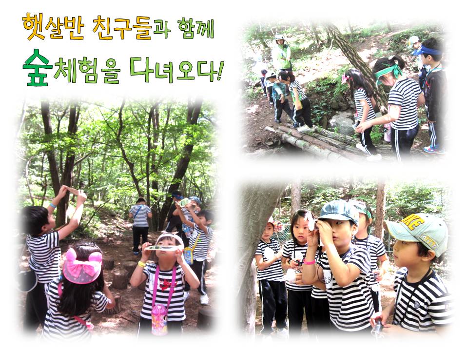 설레는 마음을 안고 팔공산으로 향합니다. 팔공산에 도착하니 숲 해설가 선생님께서 햇살반 친구들을 반갑게 맞이해 주십니다. 인사를 나눈 뒤 선생님과 함께 나무체조를 하면서 숲의 공기를 마셔 봅니다. "머리가 시원해 지는 것 같아요!" 나무체조가 끝난 뒤 친구들은 숲으로 향합니다. 개울과 통나무 다리를 건너 숲 속으로 걸어 들어가면서 귀여운 다람쥐도 만나고 큰 나무에 있는 신기한 곤충들도 발견합니다. “다람쥐다! 다람쥐를 밖에서 못 봤는데 난 벌써3번이나 봤어~” “공기가 깨끗해서 숲 속에도 동물이 살고 있나봐” 숲 속으로 걸어가다가 통나무를 발견하여 친구들과 함께 균형 잡기도 하고 가위바위보도 하면서 재미있는 놀이를 해봅니다.