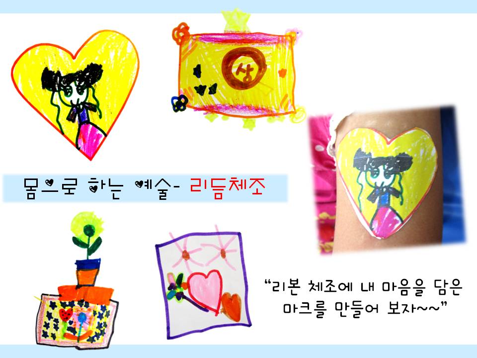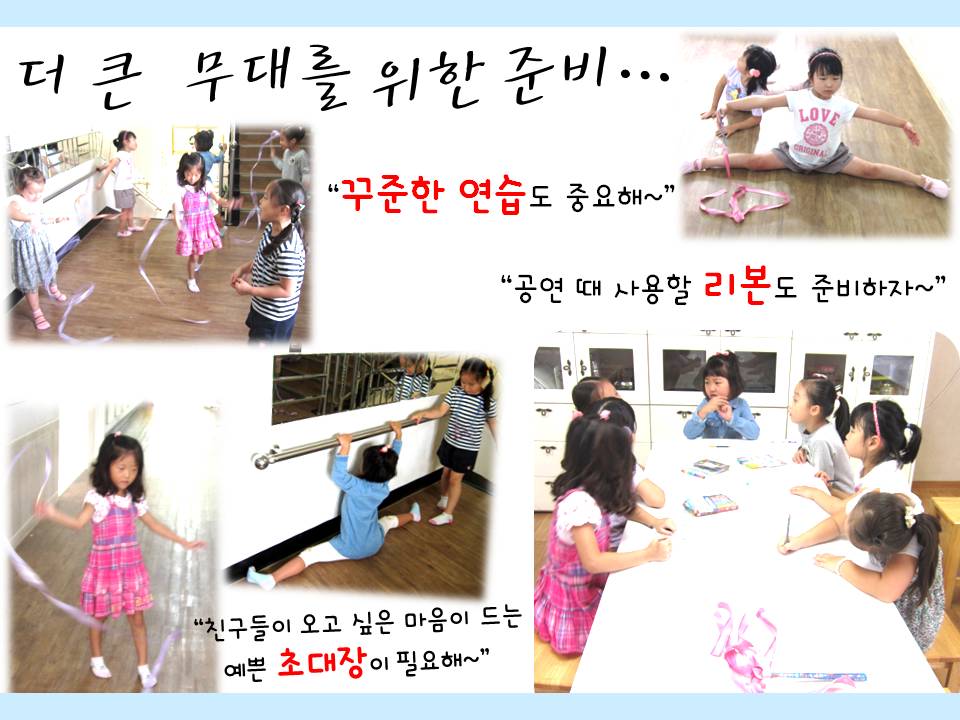 짧은 시간이였지만 친구들에게 보여준 작은 무대 경험을 계기로 유아들은 더 큰 무대에서 펼쳐지는 공연에 큰 기대를 가지고 계획을 세워보기로 합니다. “작년에 같은 반했던 친구들과 동생들에게 우리 공연을 보여주고 싶어요!” “우리들이 리듬체조에 관심이 많은 것처럼 친구들도 우리 공연을 보면 관심도 많아지고 올림픽 기억도 떠올릴 수 있잖아요~” “그리고 우리한테 배우고 싶은 친구들에게는 우리가 가르쳐 줄 수도 있고요~” 유아들과 이야기를 나누어 보면서 다른반 친구들에게 우리의 공연을 보여주기로 마음이 모아졌습니다. 그리고 공연을 위해 우리들이 준비해야 하는 것들도 파악해 보기로 하였습니다.“끝까지 마무리를 잘하려면 연습을 꾸준히 잘해야 해” “연결 동작도 잘 생각해야 하는데.. 난 리본 던지고 받는 연습을 열심히 해야지” “난 거울 보면서 표정연기 연습을 좀 더 해야 겠어~” “그럼 나는 너희들이 연습 잘할 수 있도록 도와주는 코치 할래~” “공연 날짜는 우리가 연습해보고 결정하는 게 더 낫겠지?” “선생님~ 음악이 너무 짧은 것 같아요~ 좀 더 긴 음악으로 준비해 주세요~” “공연 때 사용할 리본도 다시 만들면 좋겠어요~” “친구들에게 우리 공연을 알릴 초대장도 필요해!” 공연을 하기로 하면서 여러 가지 준비해야 할 것들을 꼼꼼히 체크해보는 유아들.. 공통의 목표를 향해서 즐겁게 준비하는 아이들의 노력들이 나 자신에게 그리고 친구들에게 감동으로 전해지길 바라며, 하늘반 리듬체조 공연! 다음 이야기를 기대해 주세요.
