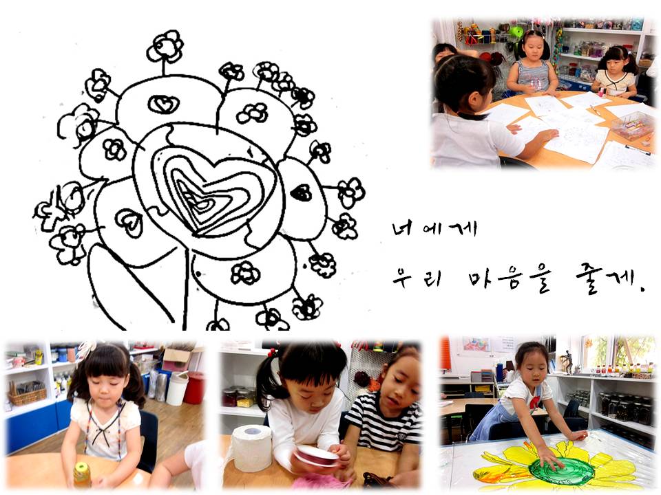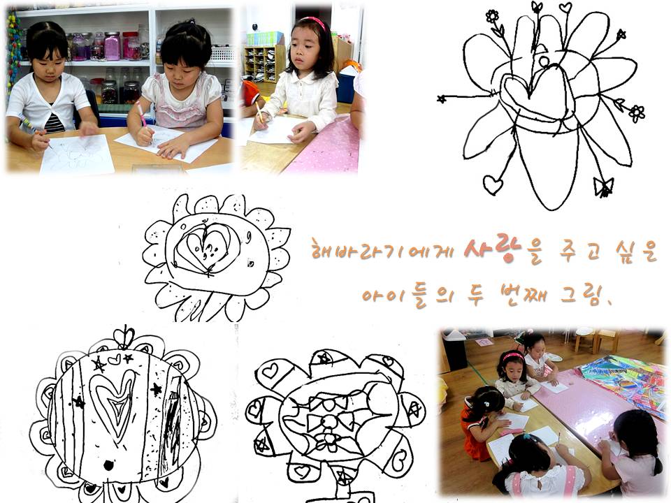 아이들은 눈에 보이지 않는 ‘마음’을 어떻게 해바라기에 담을 수 있을까요? 해바라기에 대한 사랑의 마음을 표현해봅니다. “친구들의 하트가 들어가는 모습이야.” “그럼 그렇게 그리는 게 아니라 하트는 열려 있어야 해. 그래야 나왔다가 들어갈 수도 있지.(문을 그린다.)” “음. 아냐. 하트 마음은 해바라기를 사랑하지 않는 마음이야.” “왜?” “해바라기는 사람이 아니잖아. 그러니까 다르게 꾸며줘야 해.” “그럼 어떻게 꾸며?” “식물을 사랑하는 마음은 별 마음이야.”