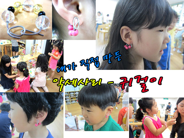 목걸이 팔찌에 제한되었던 악세사리 영역 놀이. 작은 관심이 어린이들의 놀이를 확장 시켜 줍니다. 평소 악세사리를 만들기 위해 사용하던 낚시 줄이 아닌 철사를 선택하면서 귀걸이를 만들기에 적합한 매체를 찾고 잘 활용할 수 있도록 방법을 고안합니다.