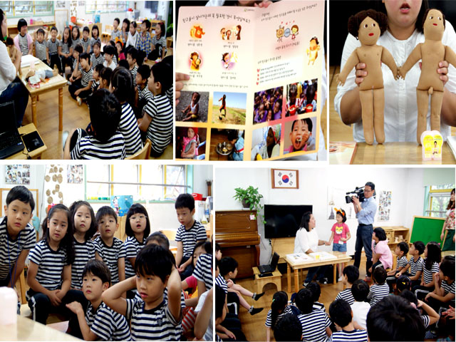 <아이들의 권리 교육> “어떤 아저씨가 어린이를 아프게 했대요. 안돼요. 하지 마세요. 해야 되는데...” 요즈음 일어난 여러 가지 사건 사고들 때문에 아이들의 마음도 혼란스럽습니다. 우리는 굿네이버스의 도움을 받아 어린이들의 다양한 권리(보호권, 발달권, 생존권 등)를 알아보고 여자어린이, 남자 어린이, 여자 성인, 남자 성인의 몸이 다름을 알아보았습니다. 우리의 소중한 몸이 나쁜 사람들에 의해 상처 받지 않기 위해 해야 하는 다양한 방법들에 대해 이야기 나누고 상황극을 해 보는 시간도 가졌습니다. “안돼요! 싫어요! 하지 마세요!” 라고 소리를 지르는 것을 물론 빨리 그 자리를 벗어나 다른 어른들에게 도움을 요청해야 한다는 것도 말입니다. 가정에서도 어린이들이 스스로 자신의 몸을 지킬 수 있도록 꾸준히 지도 부탁드립니다.