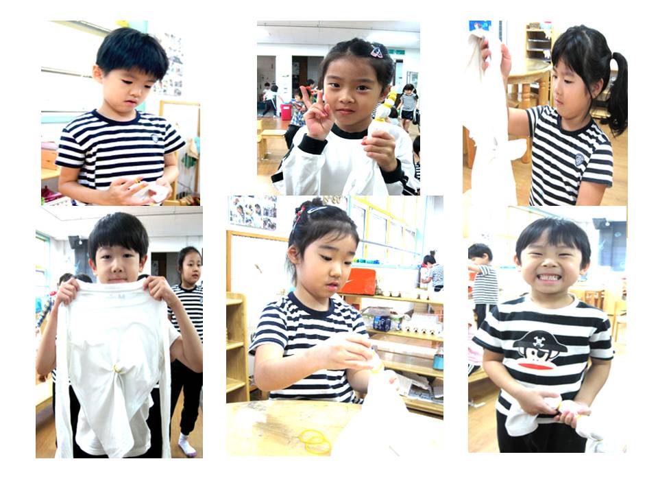 자연에서 얻어진 여러 재료들로 천연염색을 하지요. 이슬반 친구들도 천연감물염색을 해보았답니다. 먼저 가지고 온 옷과 손수건을 고무줄로 묶는 홀치기를 하였어요. 여러 가지 방법으로 묶으면서 염색이 된 후 모습도 궁금해졌답니다. 그리고 나서 감물 염색 방법 대해서 알아보았어요.