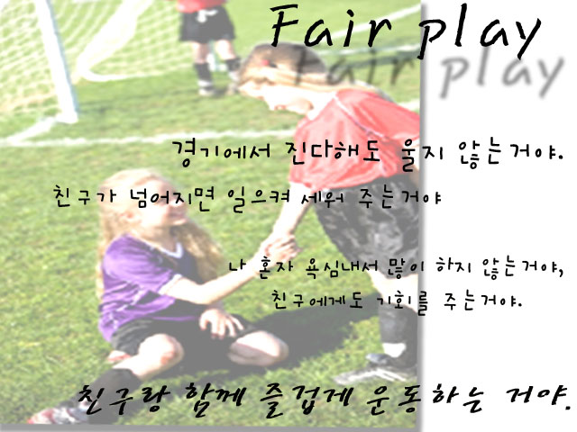 - 페어플레이? - 페어플레이는 경기에서 져도 화를 내지 않는 거야.