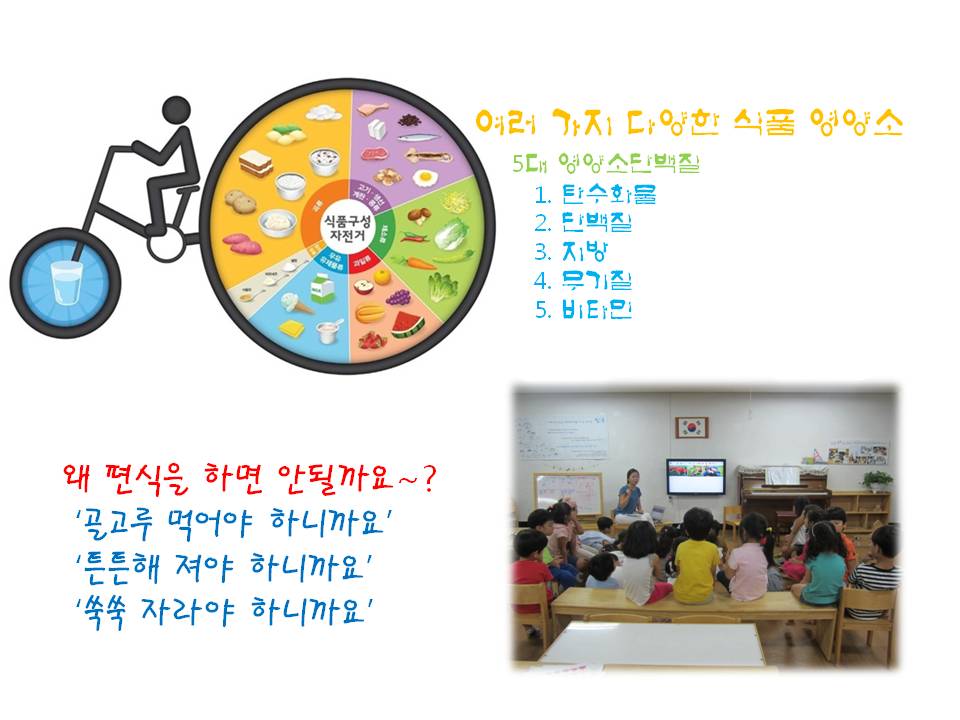 나와 가장 가까운 가족, 친구들과 함께 운동회를 하면서 어린이들은 그들이 말 하는 <정정당당한 경기> 즉, 경쟁 속에서 다른 사람에 대한 배려와 이해심 함께 즐기는 태도를 길러가지 않을까요? 운동회 날 승패의 여부를 떠나 즐기는 과정 속에서 소중한 가치를 익혀나가는 잎새반 가족들의 모습을 기대 합니다. 잎새!잎새!파이팅^^<어린이 영양교육>