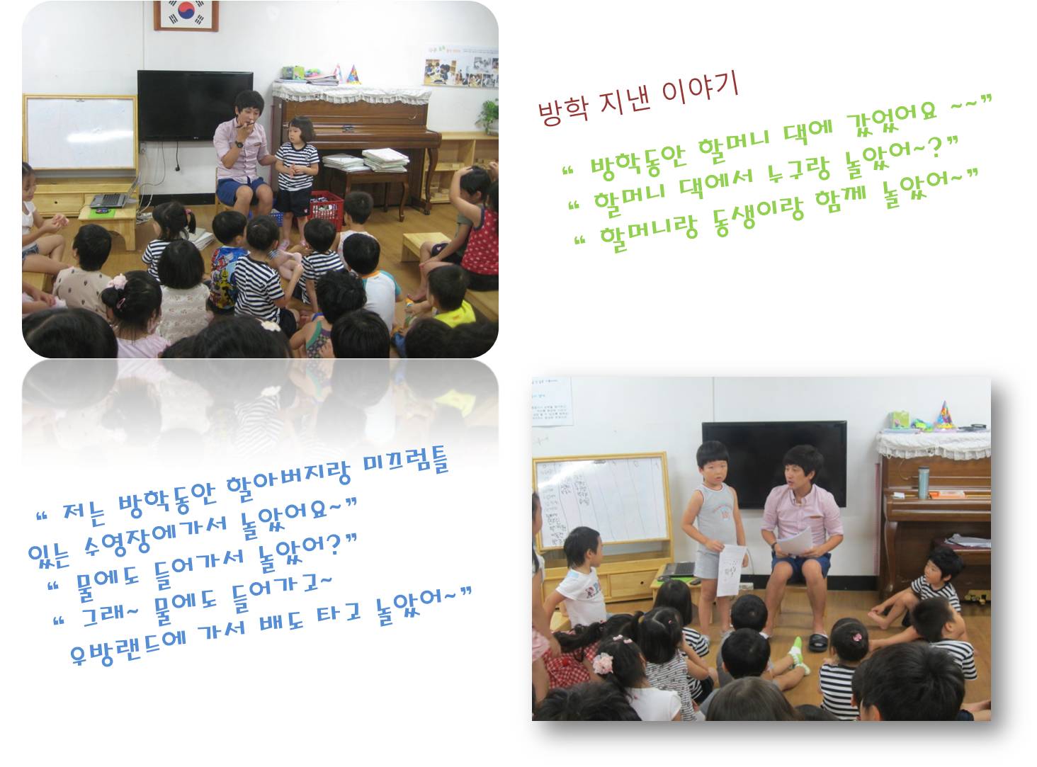 “응, 그런데 돌에 찍혀서 발이 다쳤어” 저마다 방학동안 겪었던 자신들의 경험에 대해 이야기하고, 방학동안 보지 못했던 아쉬움에 서로가 서로에게 궁금한 점에 대해 질문을 주고 받습니다.