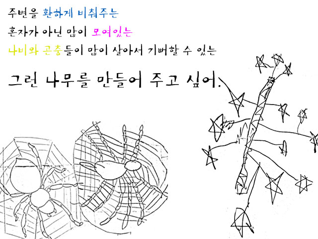 - 나는 별 나뭇잎을 만들어 줄 거야. 왜냐하면 별이 달린 나무가 환하게 빛났으면 좋겠어. 빛이 난다는 것은 좋은 거니까.