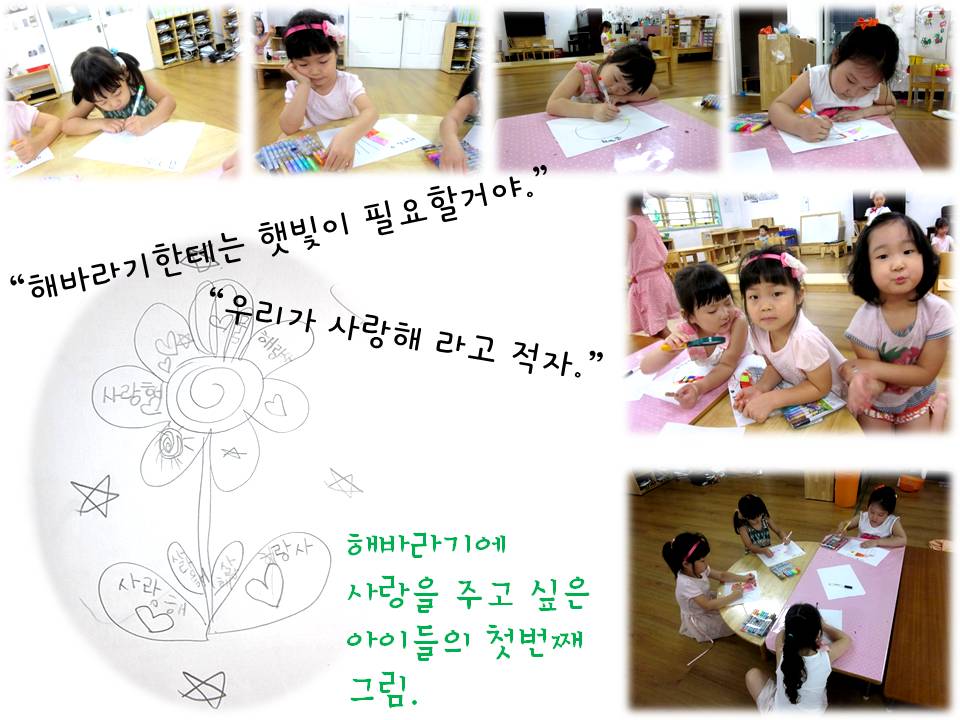 “우리가 (해바라기를)사랑해주면 해바라기도 우리를 사랑해 줄 거야.” “우리가 어떻게 해바라기를 사랑해주지?” “예쁘게 꾸며주자.” “반짝이도 붙이면 좋을 것 같아. 반짝이를 붙이면 깨끗해져서 우리를 사랑해줄 것 같아.” “옆에 <해바라기야 사랑해>라고 적자. 글자만 적지 말고 예쁜 말도 해주자.” “하트도 그리자.” “옆에 사랑이 솟아나는 걸 그리자.”