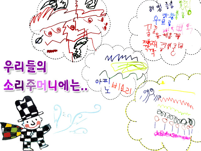 어린이들과 함께 동화책 <소리를 찾아>를 읽어 보았습니다. 동화의 내용은 어느 마을에 소리가 모두 사라져 사람들이 아무런 말도 할 수 없어 답답해하고 있을 때, 꼬마 체스가 소리를 찾아 떠납니다. 체스는 소리 주머니에 자신이 찾은 여러 소리를 담아와 마을의 소리를 다시 찾아준다는 내용입니다. 동화를 읽고 어린이들은 체스처럼 우리들의 소리 주머니를 채우기로 하였습니다. “난 지난번에 천둥번개 소리를 들었어!” “내 소리 주머니에는 방학 때 들은 파도소리가 들었어.” “이건 빗소리에요.” “바람 소리도 들었잖아!” “친구들이 이야기 하는 소리도 있어.” “체스보다 우리 소리 주머니가 더 크겠다~!! 하하”