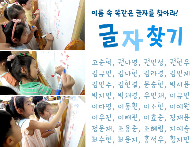 “권수인 선생님 이름에 <권>이랑 내 이름에 <권>이랑 똑같아요~!” “나는 임애정 선생님 <정>이랑 똑같은데~!” “윤지, 시윤이, 재윤이는 다 똑같이 <윤>이 들어간다! 신기하다~” 요즘 편지쓰기를 하면서 친구 이름을 적고 책을 읽을 때도 한 글자씩 스스로 읽는 글자가 늘어나더니 문자에 대한 어린이들의 관심이 커졌습니다. 문자에 대한 어린이들의 관심을 확장시켜주기 위해 매일 2, 3명 친구의 이름을 칠판에 쓰고, 책을 볼 때나 아는 글자 중에 친구의 이름이 들어간 글자와 같은 글자가 있는 것을 찾아 적기로 하였습니다. 이번 기회를 통해 글자를 가지고 놀아보며 관심을 키워가는 계기가 되기를 바랍니다.★관찰영역 이야기★