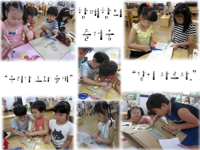 아이들의 힘으로 두꺼운 박스를 자르기란 쉽지 않습니다. 하지만 친구들의 도움과 나의 노력으로 튼튼한 박스를 조금씩 잘라갑니다.