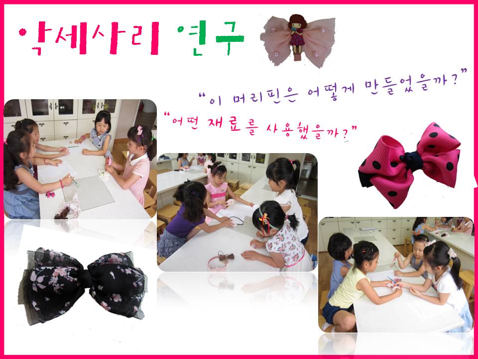 이 경험을 통해서 친구들이 발견한 아이디어를 악세사리 만들기에 적용해 보고, 다른반 친구들에게도 우리가 만든 특별한 악세사리를 소개해주며 함께 나누어 보는 시간도 계획해 봅니다.