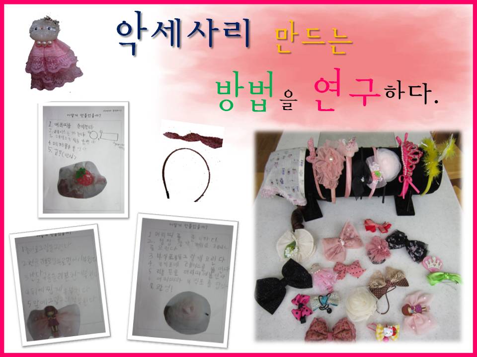 “이 핀은 우리 이모가 만든 건데 우리도 쉽게 만들 수 있을 것 같아!” “천을 동그라미로 여러 장 잘라서 겹치면 꽃모양처럼 만들 수 있구나~ 머리띠 만드는 친구들에게 알려주면 좋을 것 같아~” “리본만 접어서 매듭지어 묶어 핀만 붙이면 완성이네~ 정말 간단하다~”“직접 만들면 돈도 절약할 수 있고, 내가 만든 악세사리여서 더 뿌듯하고 기분도 좋아지잖아”