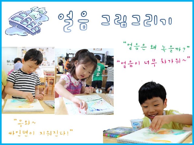 수성 싸인펜으로 그림을 그린 후 얼음으로 그림 위를 빙글 빙글 문질러봅니다. “얼음 때문에 손이 차가워요.” “그림이 점점 없어져요.” “제가 그린 아이스크림이 얼음 때문에 꽁꽁 얼 것 같아요.” 얼음이 지나간 자리는 어떻게 되었을까? 얼음이 녹으면서 물이 되고 수성 싸인펜이 번지면서 멋진 작품이 되었답니다. 무더운 여름 시원한 얼음으로 그림 그리기는 색다른 경험을 선물해 주었습니다.