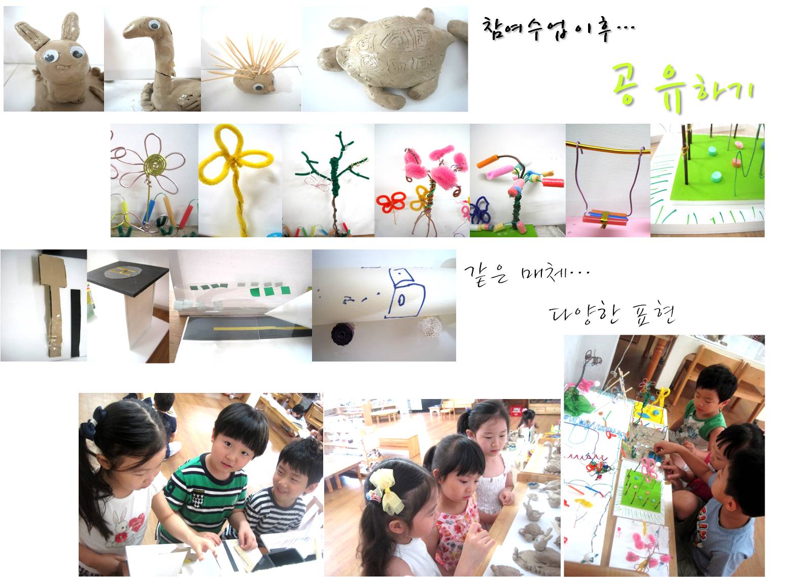 여러 가지 매체 중에서도 종이, 철사, 찰흙은 교실에서 흔히 다루기는 하나 도전적이면서 갈등의 요소가 많은 매체입니다. 친구들은 참여수업을 통해 부모님과 함께 매체가 가지고 있는 특성을 경험하고 활용해보면서 매체들을 다양한 시각에서 바라볼 수 있었습니다.