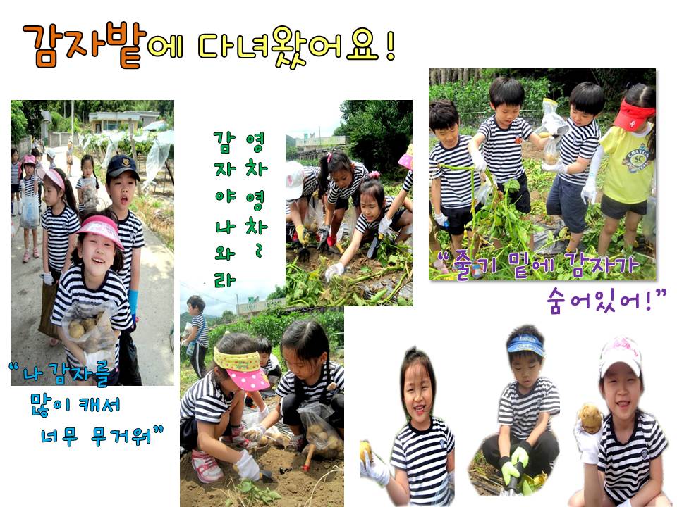 따뜻한 햇볕과 시원한 바람이 부는 화창한 날씨에 친구들과 함께 설레는 마음을 안고 감자밭으로 향했습니다. 감자밭에 도착한 친구들은 선생님의 설명을 듣고, 감자 줄기를 들어봅니다. “감자가 땅 속에 꼭꼭 숨어있었어”“와~내 얼굴만한 왕감자를 찾았어!”“열심히 캐서 봉지에 가득 담아야지!”감자의 줄기에 조롱조롱 매달려 있는 것을 보며 신기해하는 친구들! 삽으로 흙을 파고, 손으로 살살 털어내며 너도 나도 하나씩 감자를 뽑아내는 친구들의 얼굴은 즐거움으로 가득해 보입니다. 또, 감자를 한가득 안고 유치원으로 향하는 친구들의 발걸음은 무척 가벼워 보입니다. 친구들은 감자를 직접 캐어보는 경험을 통해 감자를 수확하기 위해서는 값진 노력의 과정이 필요하다는 것을 느끼게 되었답니다.