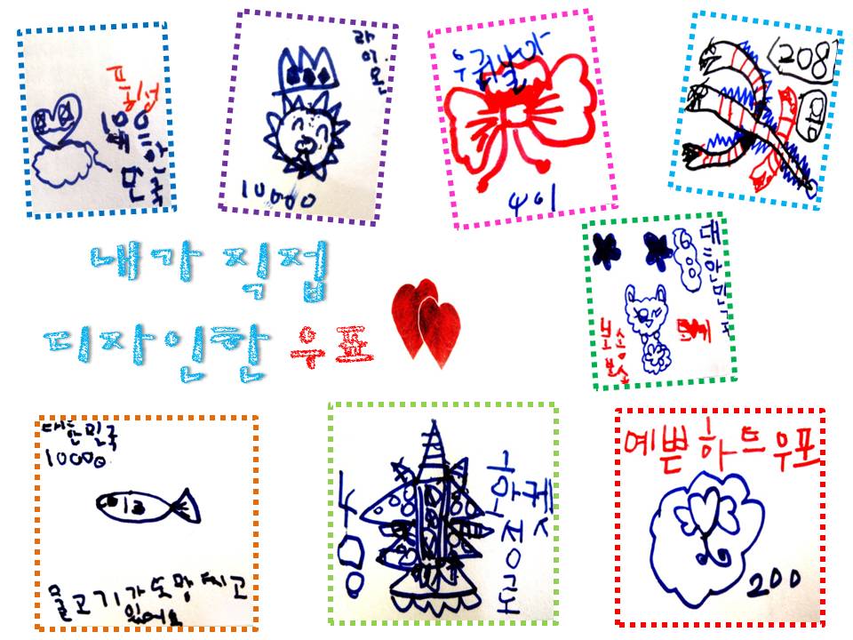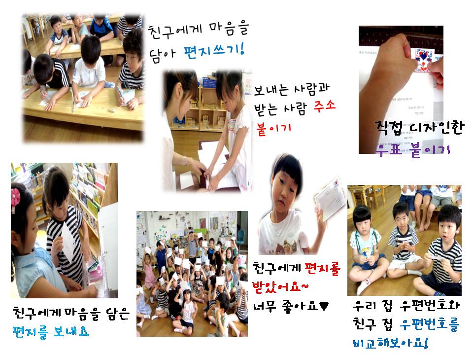 지난주에 우표전시회를 다녀온 후 어린이들은 다양한 디자인의 우표에 관심을 갖게 됩니다. 우표는 요금, 나라 이름, 다양한 종류의 그림으로 구성되어 있다는 것을 알게 된 후 자신만의 우표를 디자인 해 봅니다. 또, 가정에서 수집한 편지봉투를 보며 주소에도 관심을 가집니다. "우리 집 주소만 쓰면 우리 집으로 다시 돌아올 것 같아" "편지 봉투에 받는 사람의 주소를 써야 우체부 아저씨가 편지를 잘 전달해줄 수 있을 것 같아." ”보내는 사람의 주소를 써야지 누가 편지를 보냈는지 알 수 있고, 답장을 쓸 수 있을 것 같아“ 편지봉투에는 보내는 사람과 받는 사람의 주소, 이름, 우편번호를 기입해야 한다는 것을 알게 된 후 신기한 점을 또 발견합니다. "어? 친구 집 우편번호와 우리 집 우편번호가 다르네?"