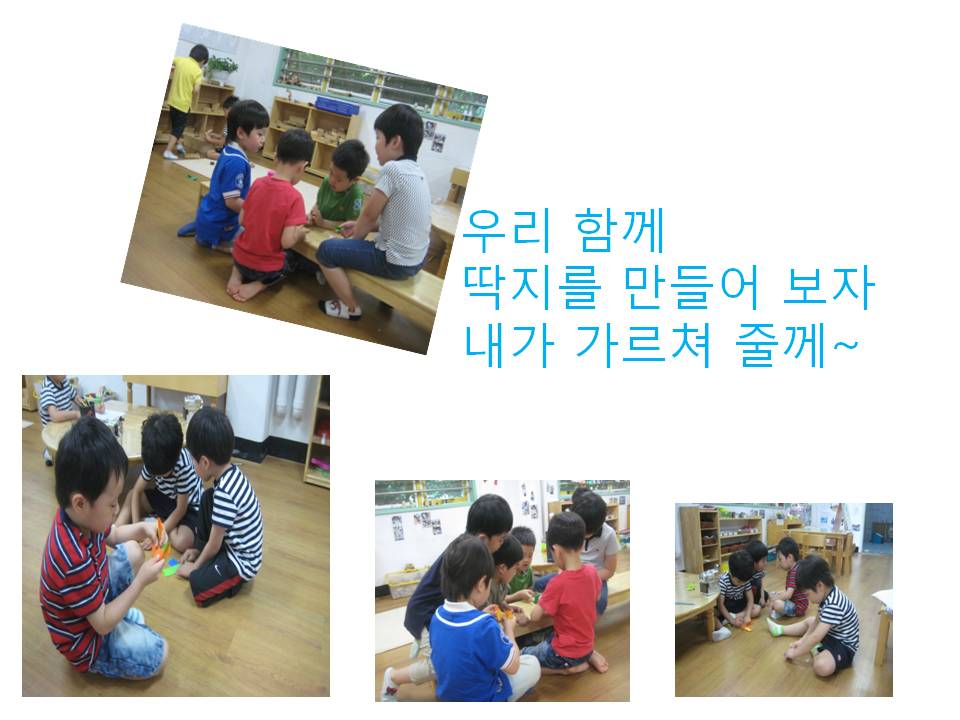 ‘나도 딱지 접기 가르쳐줘’ ‘응, 이리루 와’ ‘내가 접는 방법 가르쳐 줄게’ 모두 함께 모여 앉아 딱지 접기 활동을 시작합니다.