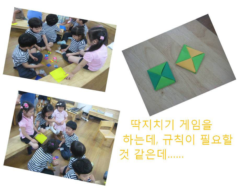 ‘선생님 내가 딱지를 치니깐 뒤집어 졌어요’ ‘나도 뒤집었어요’ ‘친구야~너도 해’ 서로가 서로를 격려하며 신나게 딱지치기 활동을 이어갑니다. 그러다 작은 다툼이 일어납니다. ‘이번엔 내가 할 차례라고’ ‘내가 할꺼다’ ‘내가 해야 한다고’ 지켜보던 친구 한명이 말을 합니다. ‘그럼 우리 누가 먼저 할지 순서를 정하자’