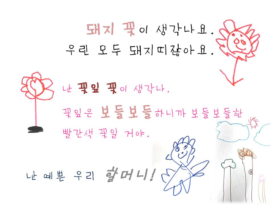 “꿀! 꽃잎반하면 꽃이고 꽃에는 꿀이 있으니까.” “해바라기. 해바라기에 꿀이 있잖아. 그럼 벌들이 꿀을 가져가잖아.”“(꽃잎반은)진한 빨강색 장미 같아. 장미는 향기가 진해.” “돼지 꽃이 생각나. 여기 있는 친구들은 다 돼지띠잖아!” “햇살 받은 꽃이 생각나. 색깔은... 빨간색. 보들보들한 느낌의 꽃이 생각나.”