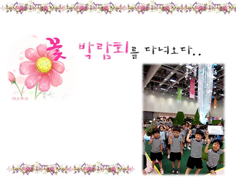 아이들은 나의 경험 속에 살아있는 <꽃잎반>의 이미지를 꺼냅니다. 그리고 꽃잎반하면 생각나는 것을 글과 그림으로 표현해봅니다. 꽃잎반의 <꽃>이라는 단어 때문인지 꽃의 이미지를 많이 떠올리는 꽃잎반 아이들. 엑스코에서 열리는 꽃 박람회를 보며 꽃을 이용한 다양한 작품을 감상해보기로 합니다.<“꽃”으로 만든 작품. 대구 꽃 박람회>