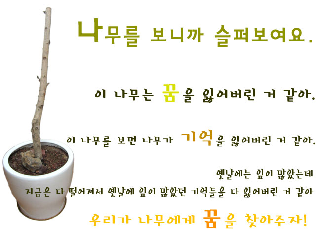 - 이 나무는 기억을 잃어버린 거 같아. 옛날에는 잎이 많았는데 지금은 없으니깐 그 기억을 다 잊어버린 거 같아요. <이 나무는 꿈을 잃어버린 것 같아요.>