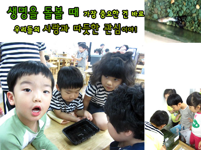 - 물고기가 구슬을 먹었나? - 우리가 사랑을 주지 않아서 그래. - 맞다. 아침에 오면 잘 있었는지 물어도 보고 집에 갈 때도 인사를 하면서 사랑을 줘야하는데... 어린이들은 잎새반에서 함께 살아가는 물고기의 죽음이 왜 일어났는지에 대한 생각을 펼쳐 봅니다. 그리고 어린이들 스스로가 물고기에게 필요한 것은 따뜻한 사랑과 관심이라는 것을 이야기 하며 <관심>을 가지고 생명을 <돌보는 것>은 아주 중요한 것이라는 것을 생각 할 수 있게 해 주었습니다. 남은 네 마리 물고기한테는 매일매일 꼭 인사할 거예요!<친구 2차 표상>