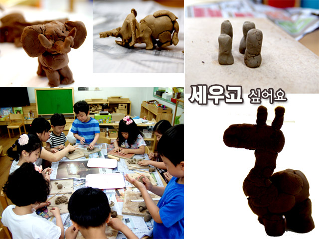 칠흙으로 동물원의 다양한 동물들을 만들어 보았습니다.“기린은 목이 길고 팔랑 거리는 귀가 있고...앉아서는 잠을 잘 수 없어요.” “카멜레온은 색깔이 바뀌지만 찰흙으로 바뀌게 할 수는 없겠지?” “토끼는 다리가 네 개지만 앉으면 다리가 두 개 손이 두 개가 되기도 해요.” “코끼리 코 옆에는 상아가 있고..몸을 조금 뚱뚱하게 만들거야” 이야기 나눈 동물의 특징을 바탕으로 만들기 시작! “안 세워져요! 이것 좀 해주세요.” “흙풀로 붙여봐.” “다리를 굵게 하면 안 넘어져요.” “발 밑에를 편편하게 해야지.” “다리를 통통하게 하고 몸은 가볍게 하면 되요.” “찰흙 두 개를 합치지 말고 처음부터 하나로 시작해.” 세워지지 않는 문제를 바라보니 세울 수 있는 여러 가지 가설이 생겼습니다.