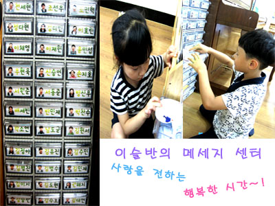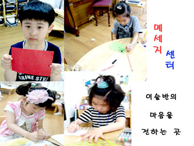이슬반에는 여러 영역들이 있습니다. 조형영역, 쌓기 영역, 찰흙영역, 구슬 영역 그 중에서도 메시지 센터는 친구들이 서로 편지를 주고받으면서 마음을 키워 나가는 영역이랍니다.