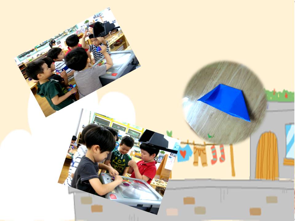 말을 마친 친구는 완성되어 있는 딱지를 하나하나 펼치기 시작합니다. 그리고 친구들과 함께 펼쳐진 딱지의 모양의 모습을 모방해서 색종이 딱지 접기를 시도합니다. 한참을 접기에 몰두하던 친구들은 딱지가 접히지 않자, 딱지가 접히지 않는 이유에 대해 이야기를 나누기 시작합니다. 그러다 뭔가를 떠올린 친구가 말을 합니다. ‘우리 아빠는 가위를 사용해서 금방 접었다’ ‘우리도 가위가 필요하다’ ‘그래 딱지를 접으려면 가위가 필요하다’ 가위를 가지고 온 친구들은 색종이의 양끝을 세모로 접고, 두 개의 색종이를 겹친 뒤 두 개의 크기가 맞도록 색종이를 잘라냅니다~